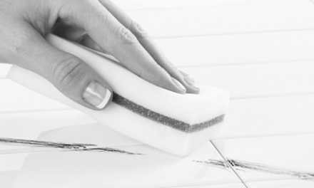 ⓐ機械的な除去方法水で湿らせた硬質研磨剤を含まないナイロンたわしでタイルの表面に付着した虹彩部分を削り取ります。さらに水を含んだメラミンフォームで拭き取ります。