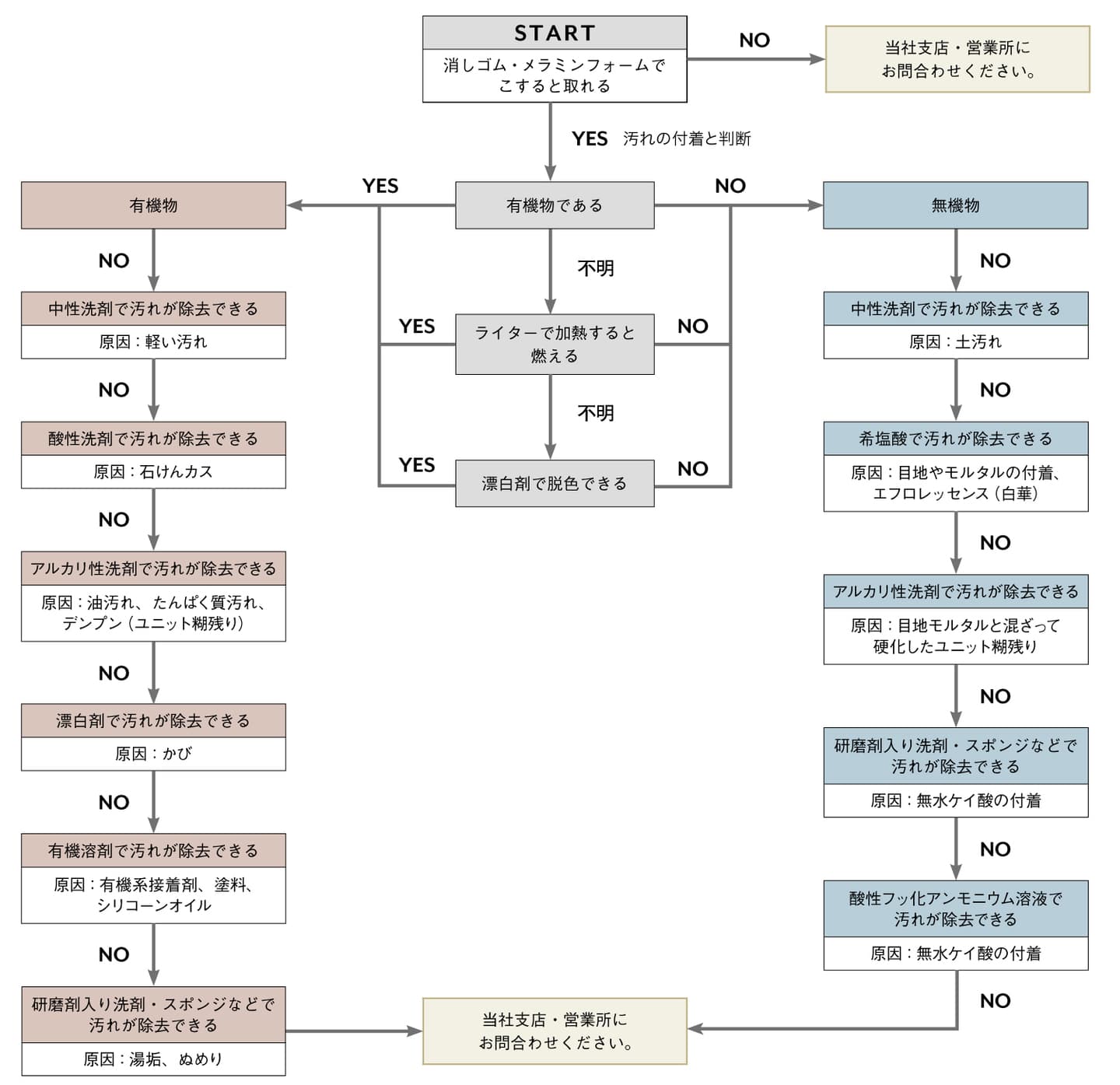 施工部位と付着した物質などでメンテナンス方法が変わってきます。例えば外装壁タイルでは、ユニット糊や目地モルタル、セメント成分がタイルに付着、施工時の誤ったタイル面洗いにより汚れが発生する場合があります。経年的な汚れとしては、大気中の排気ガスによる汚れ、雨に含まれる成分による汚れ、シーリングや雨掛かりによる汚れが発生します。また、内装タイルでは生活や使用に伴う有機物である、油やタンパク質の付着汚れ、浴室ではぬめり等が固着する汚れがあります。様々な汚れの洗浄は、付着した物質によって適切な洗浄方法を選定することが重要です。フローチャートの手順で判別し、汚れの種類にあった洗浄方法でメンテナンスを行いましょう。