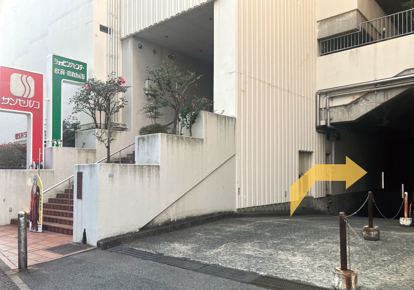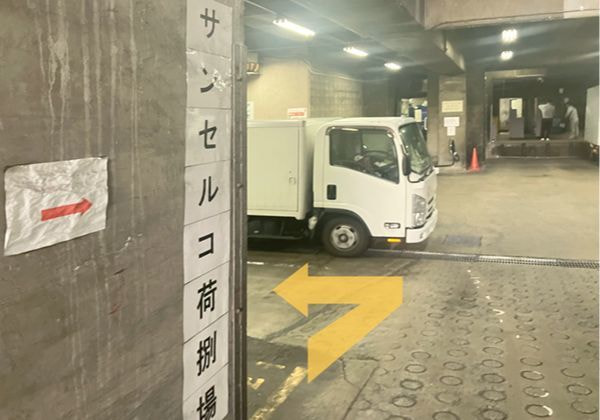 04 サンセルコの看板の手前右側、トラック搬入口を下ります。搬入口付近で通行する車両には十分ご注意ください。