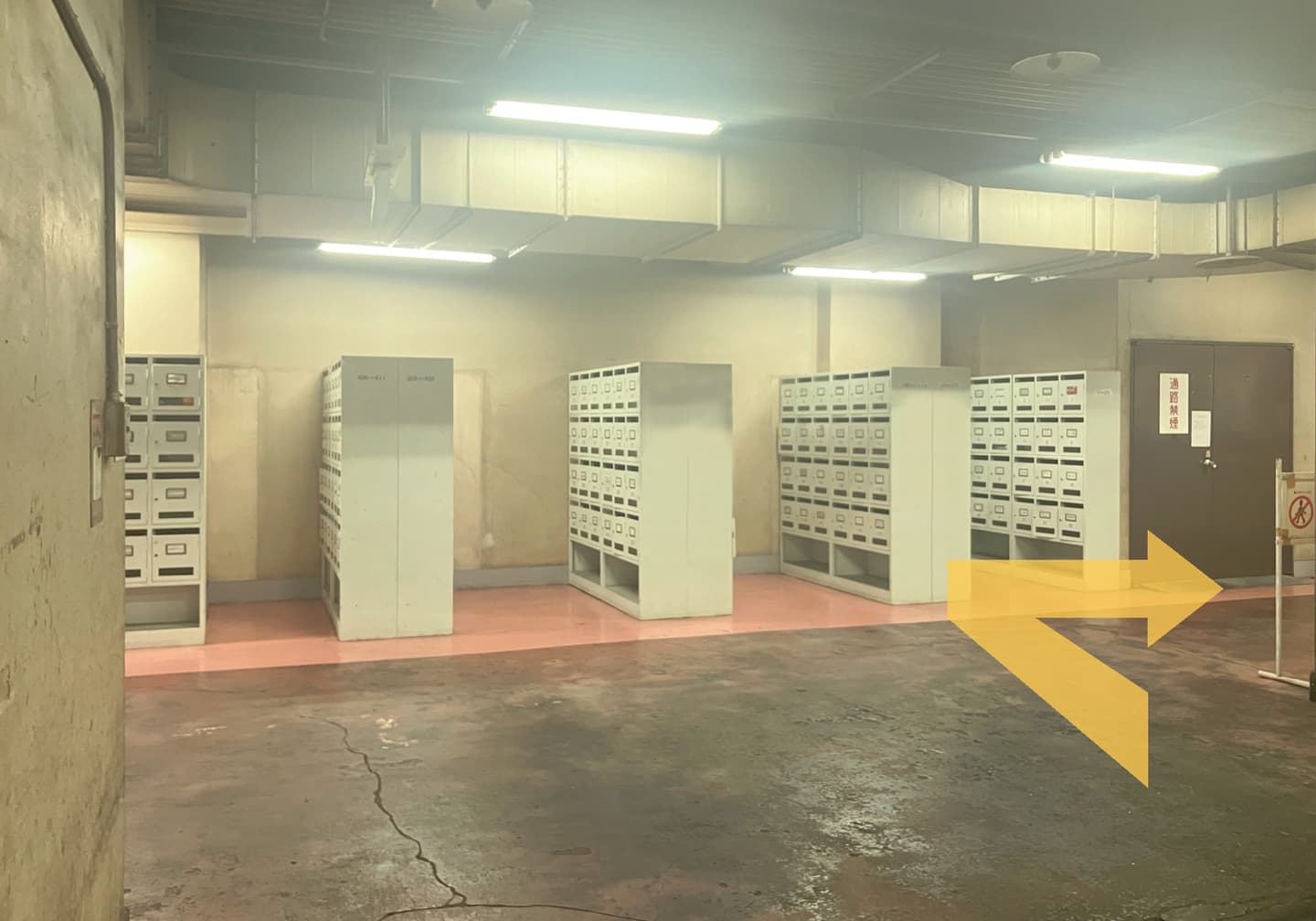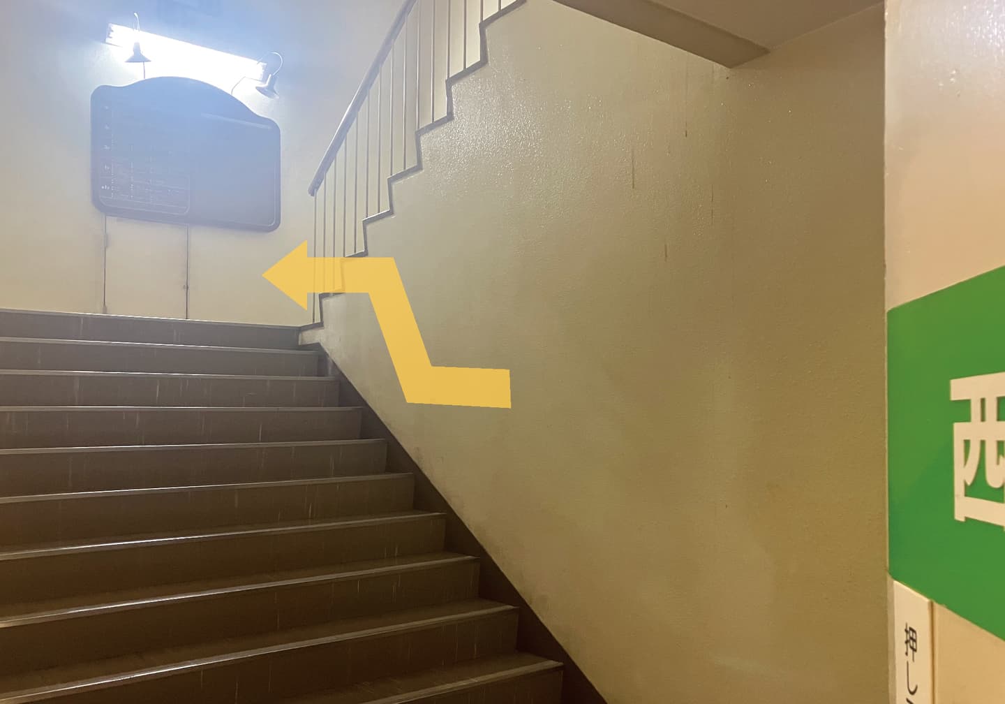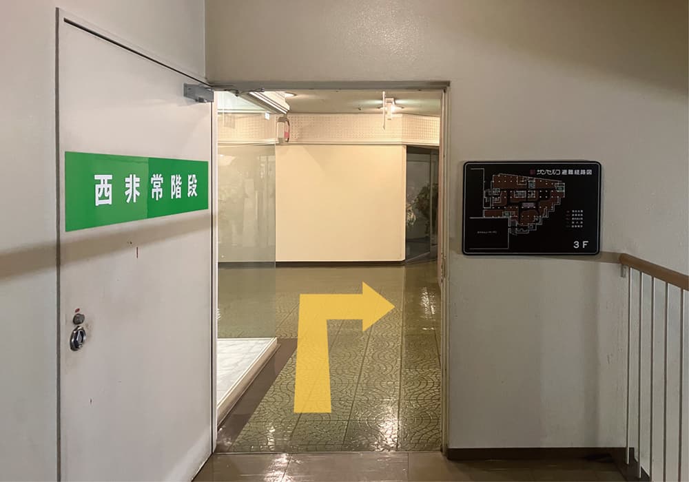 07 中に入ってすぐ右手に西非常階段の扉がありますので、守衛さんが鍵の施錠を解除している間に扉を開けてください。地下1階から3階まで階段を上がります。