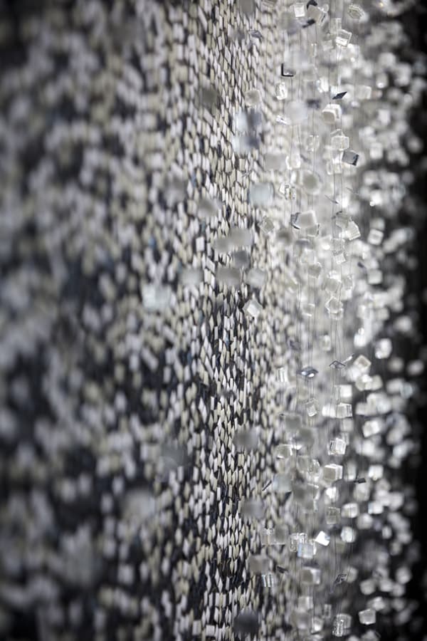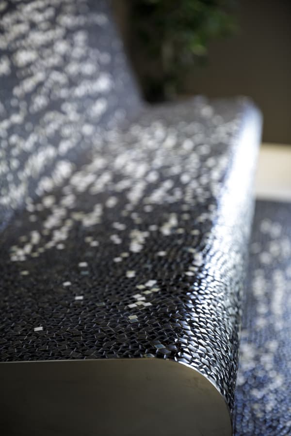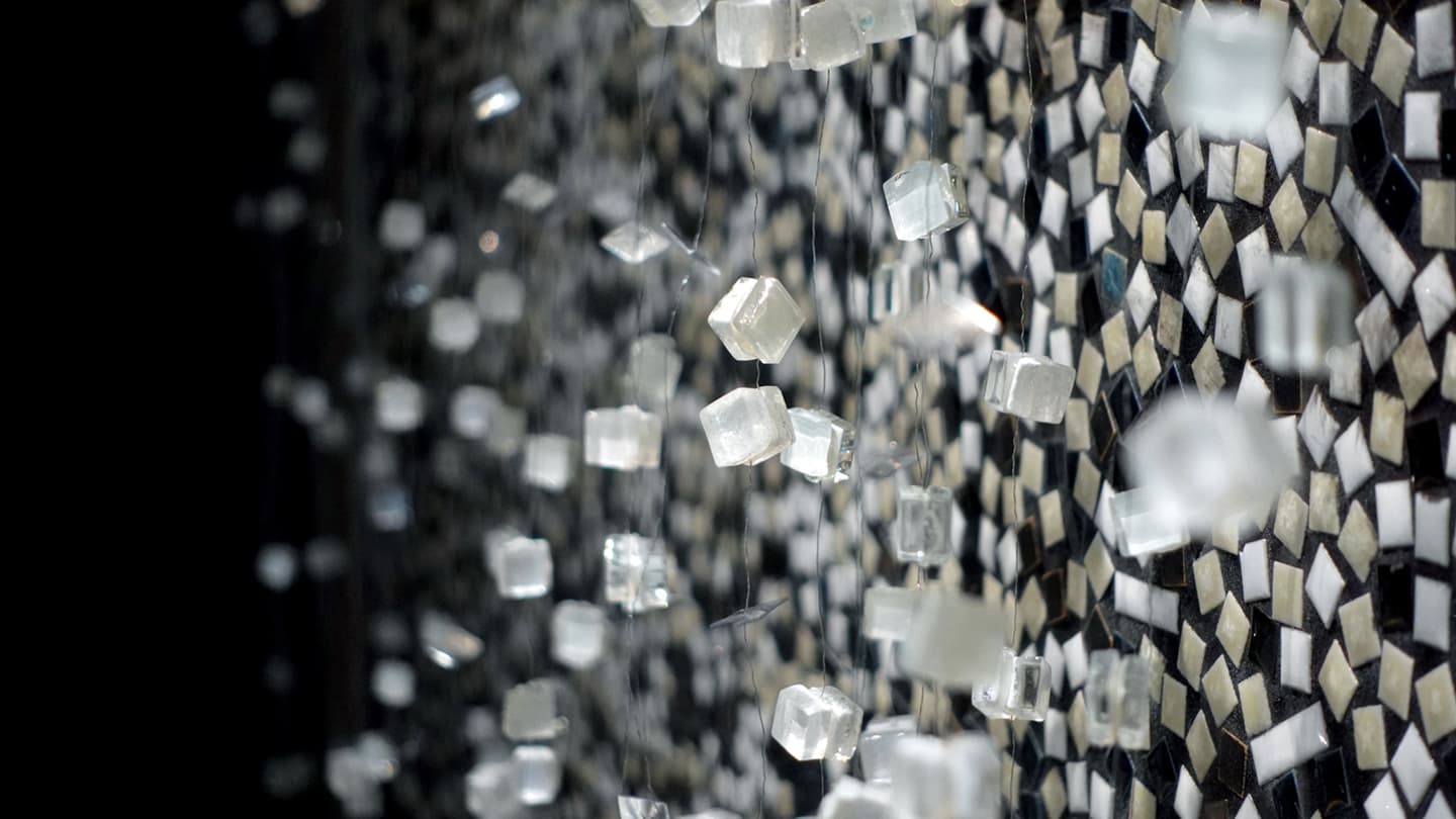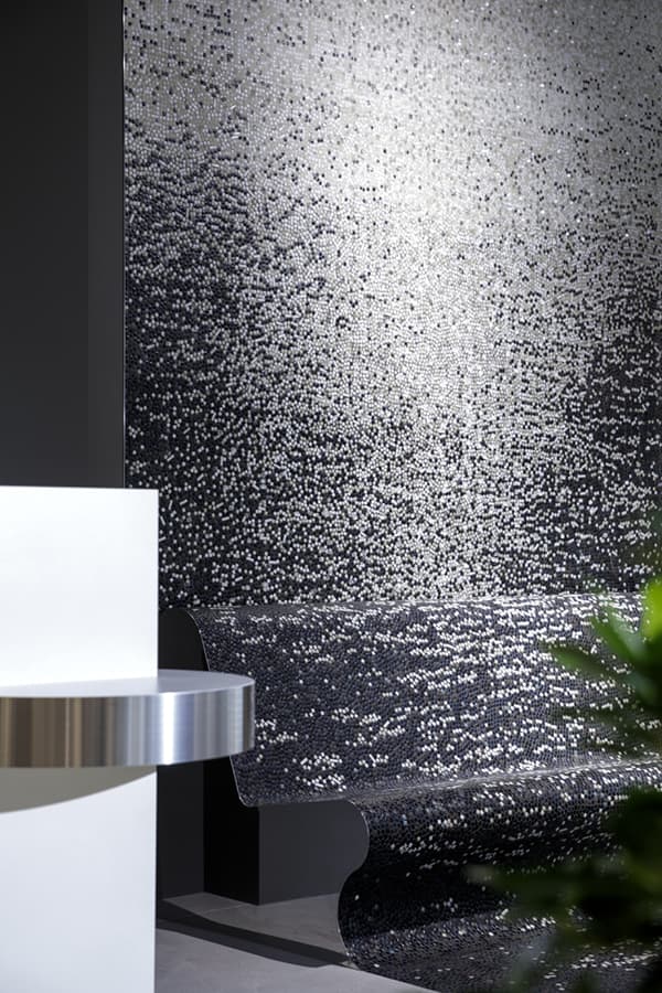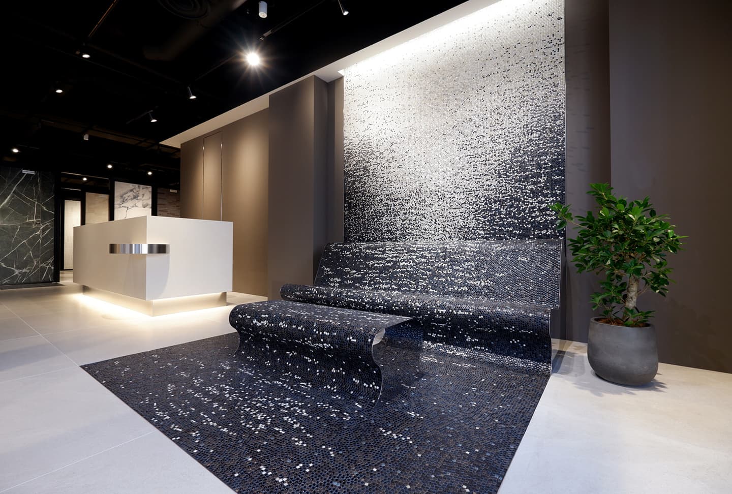 天上からふりそそぐ月の光を8万個の10mm角モザイクタイルで表現しました。職人・工場との共同作業により制作した作品です。満月の夜に現れる一瞬の光の奇跡。留められたその輝きの道は、観る方々を心きらめく空間へと導きます。