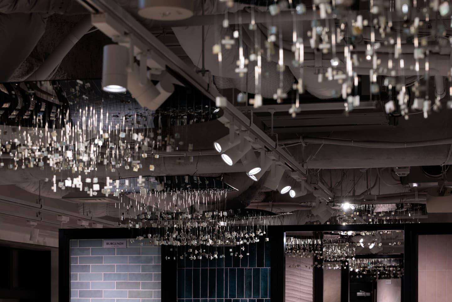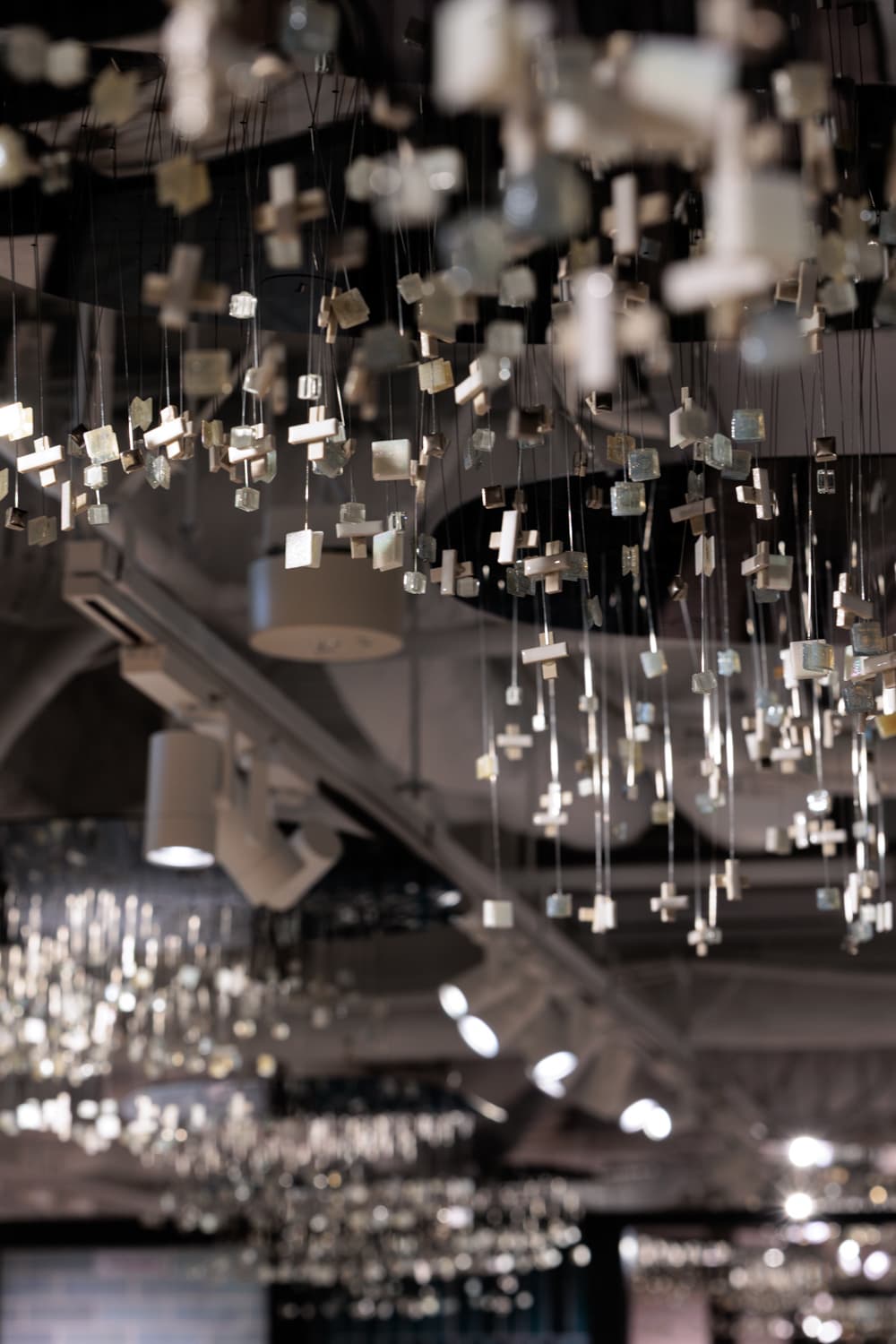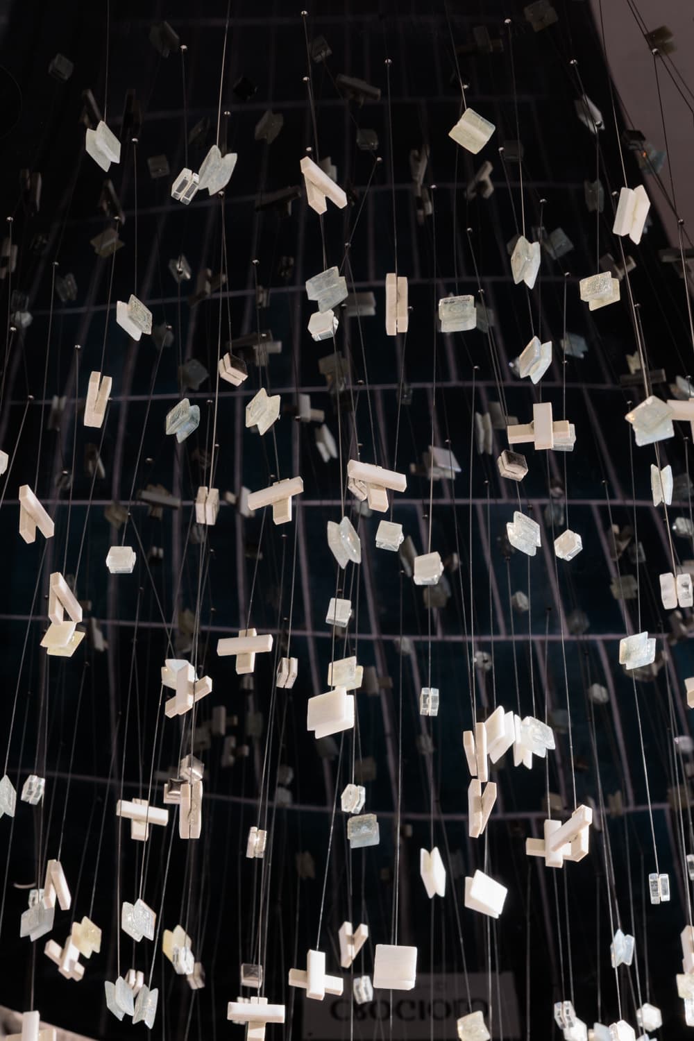 雪が静かに降る瞬間を映した「スノーフレーク」は、奥行きのある空間の中で、光の粒のような輝きを放ち、訪れる人を“道しるべ”のように誘います。グリム童話『ヘンゼルとグレーテル』の白い石に着想を得て生まれた、この静謐なアートワークをどうぞお楽しみください。
