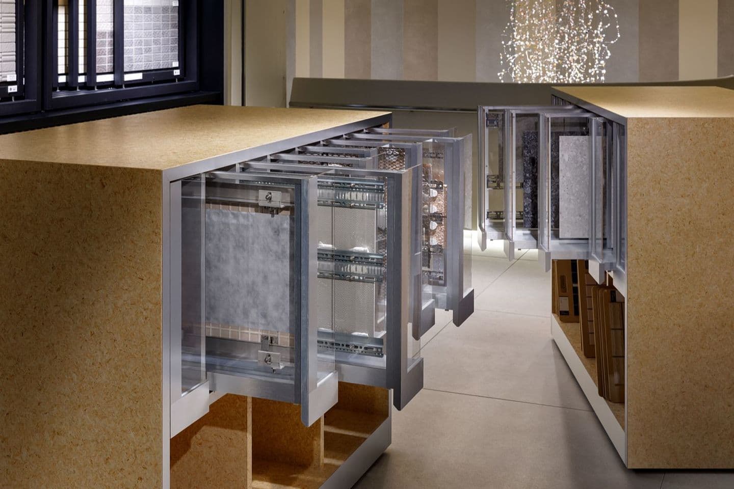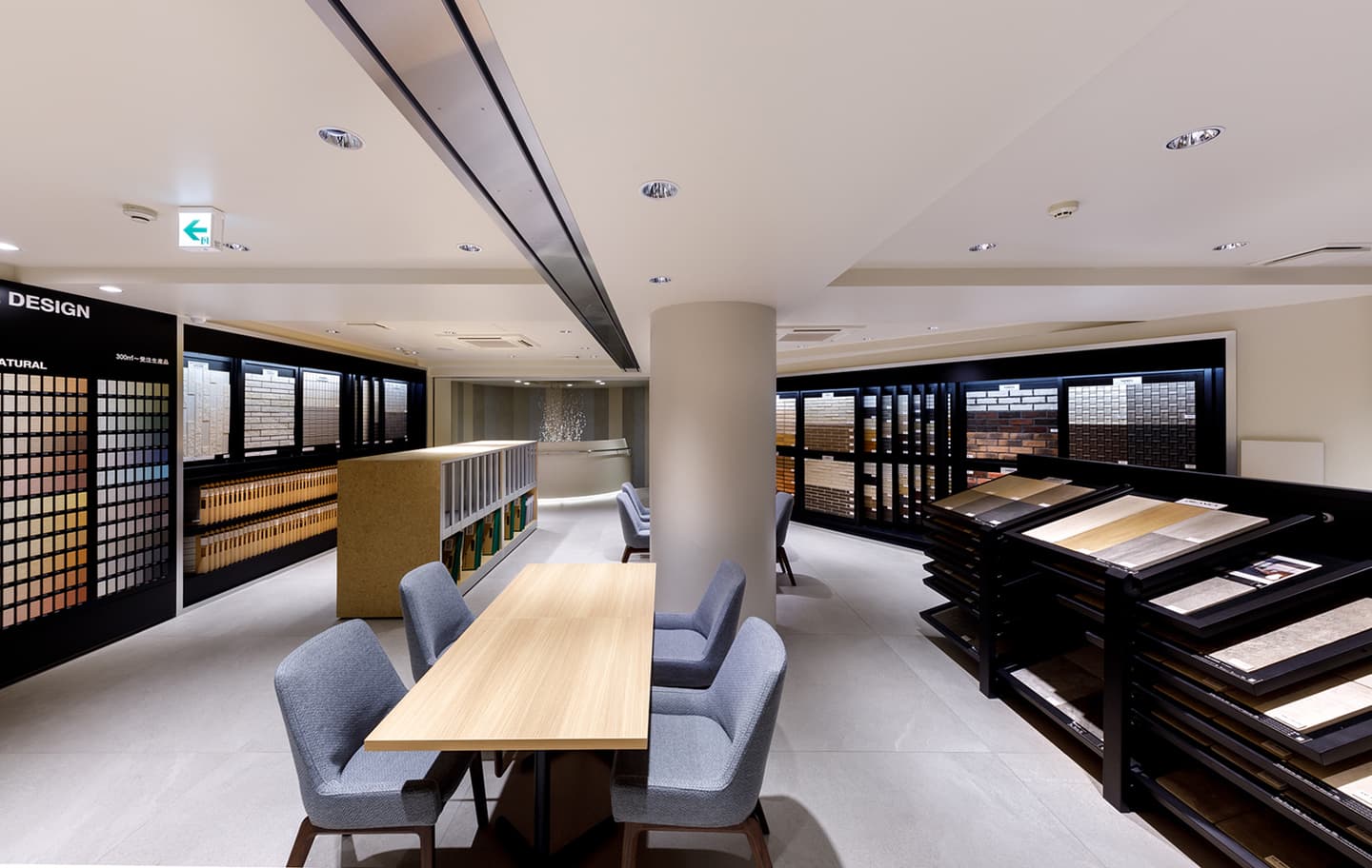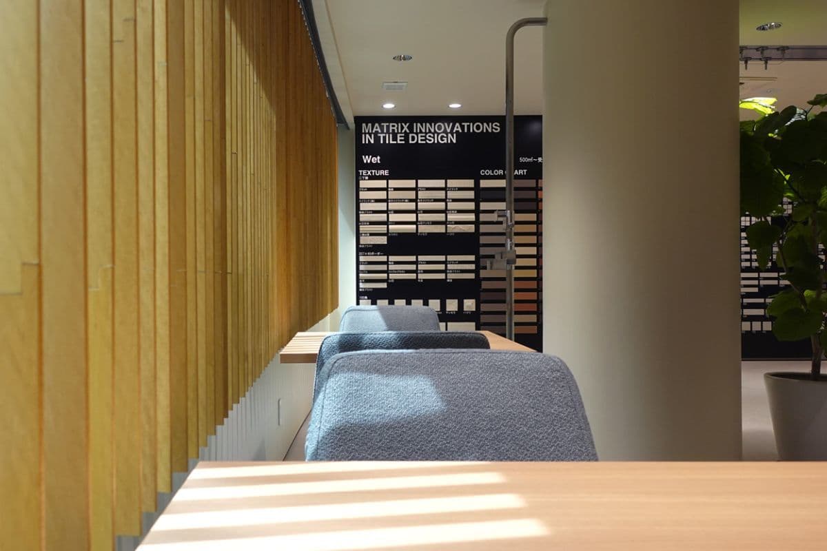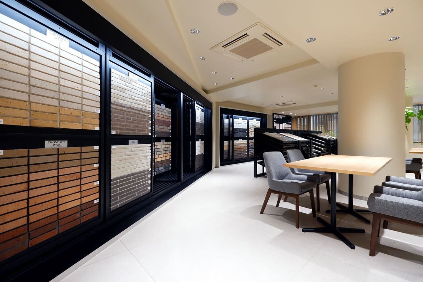 屋外壁タイル約100シリーズを南面の窓から入る外光の元でご覧頂けます。他に壁・床タイルの特注品マトリックスパネル、石材・20mm厚タイル、壁への金具併用工法のスケルトン展示も。調光調色システムも設置されており、新たなファサードデザインをご提案するフロアです。